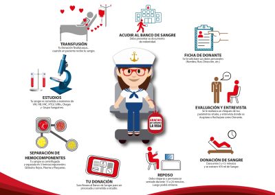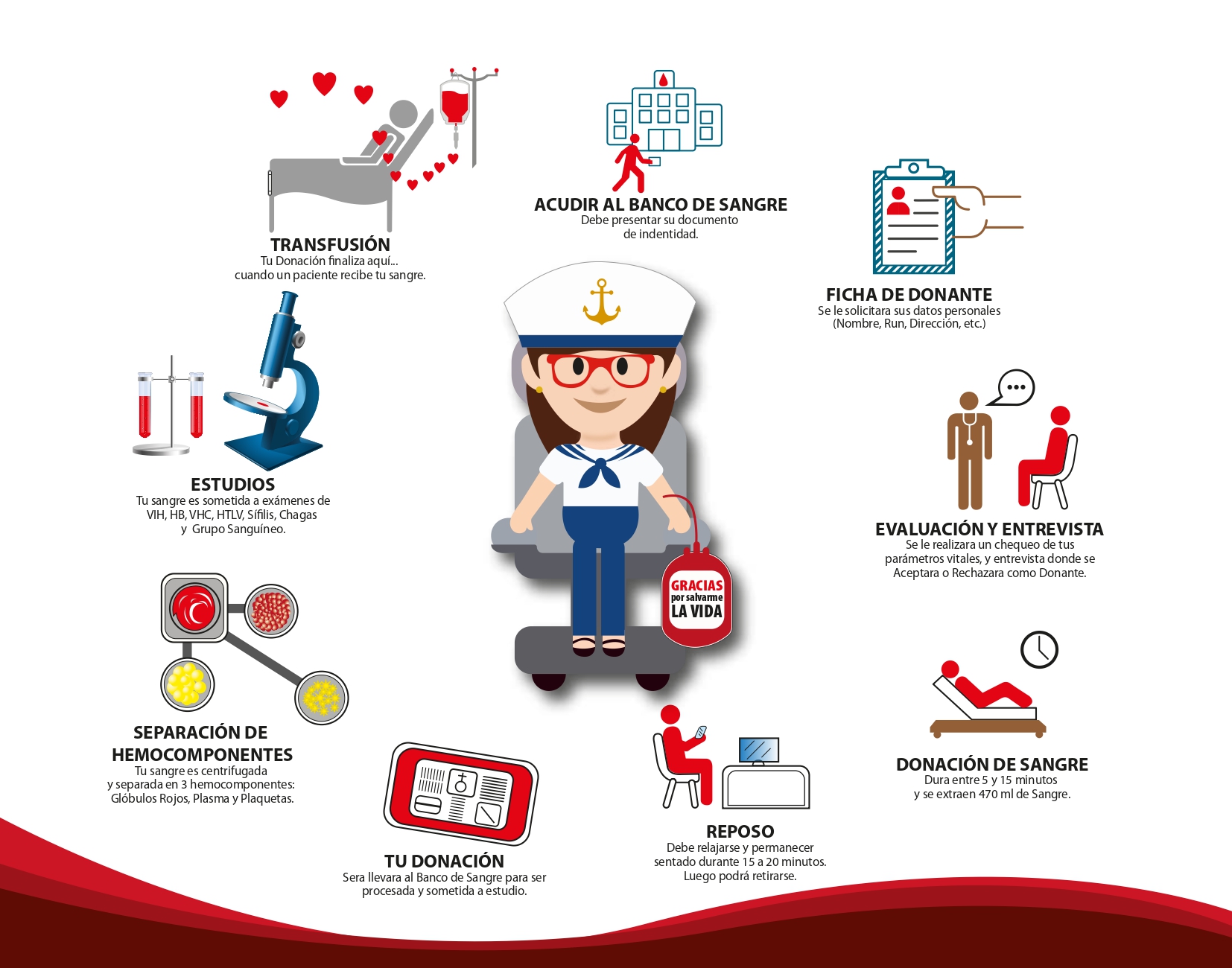 La donación de sangre es un acto voluntario y altruista. Se extraen 450 cc de sangre, lo que generalmente no produce molestias y generalmente el procedimiento dura entre 30-40 minutos. De su sangre se obtienen productos como glóbulos rojos, plaquetas y plasma que ayudarán a pacientes que lo necesitan.